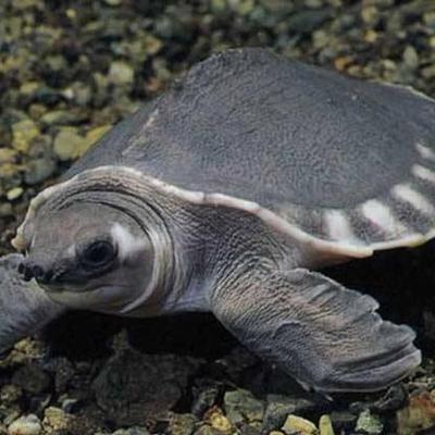 豬鼻龜(學(xué)名:Carettochelysinsculpta),亦稱飛河龜及大洋洲豬鼻龜,是兩爪鱉科下兩爪鱉屬的唯一一種。 豬鼻龜是在淡水龜世界中與別不同。 背甲的顏色一般為灰色或橄欖色,皮革有紋理,而腹甲呈奶油色。 腳趾間有腳蹼,類似海龜。 鼻子看起來像一只豬,因而得名。 雄性的尾巴較長(zhǎng)而窄,可以就此區(qū)別兩性。 豬鼻龜可以生長(zhǎng)到殼長(zhǎng)大約70厘米(28英寸),重量超過20公斤(44磅)。 在不同的屬的龜鱉中,只有豬鼻龜保留一個(gè)半球形的骨甲殼下面的革質(zhì)皮膚,而不是龜板。 他們還保留了堅(jiān)實(shí)的腹甲,強(qiáng)大的骨架連接的甲殼,是淡水龜中絕無僅有的。 豬鼻龜是雜食動(dòng)物,吃各種各樣的植物和肉類,包括無花果的果實(shí)和葉子、甲殼類動(dòng)物、軟體動(dòng)物和昆蟲。 雌性可以生長(zhǎng)至18歲,雄性則為16歲。 他們會(huì)在干燥的季節(jié)產(chǎn)卵,并產(chǎn)于沙質(zhì)河岸。 他們的后代會(huì)保持蛋內(nèi),處于休眠狀態(tài),直到條件合適才破殼而出。 而氣壓突然下降則會(huì)觸發(fā)蛋的孵化,一場(chǎng)風(fēng)暴亦即將到來;幼龜通常也因而在同一時(shí)間孵化,有助它們挖的沙子的表面而順利下水。 豬鼻龜可以通過圈養(yǎng)繁殖而出售作飼養(yǎng)用途。 雖然生長(zhǎng)緩慢,加上飼養(yǎng)成本高和成長(zhǎng)后體型龐大,使它們只適合經(jīng)驗(yàn)豐富飼養(yǎng)者飼養(yǎng)。 他們往往是害羞的,容易在飼養(yǎng)環(huán)境下產(chǎn)生壓力。
